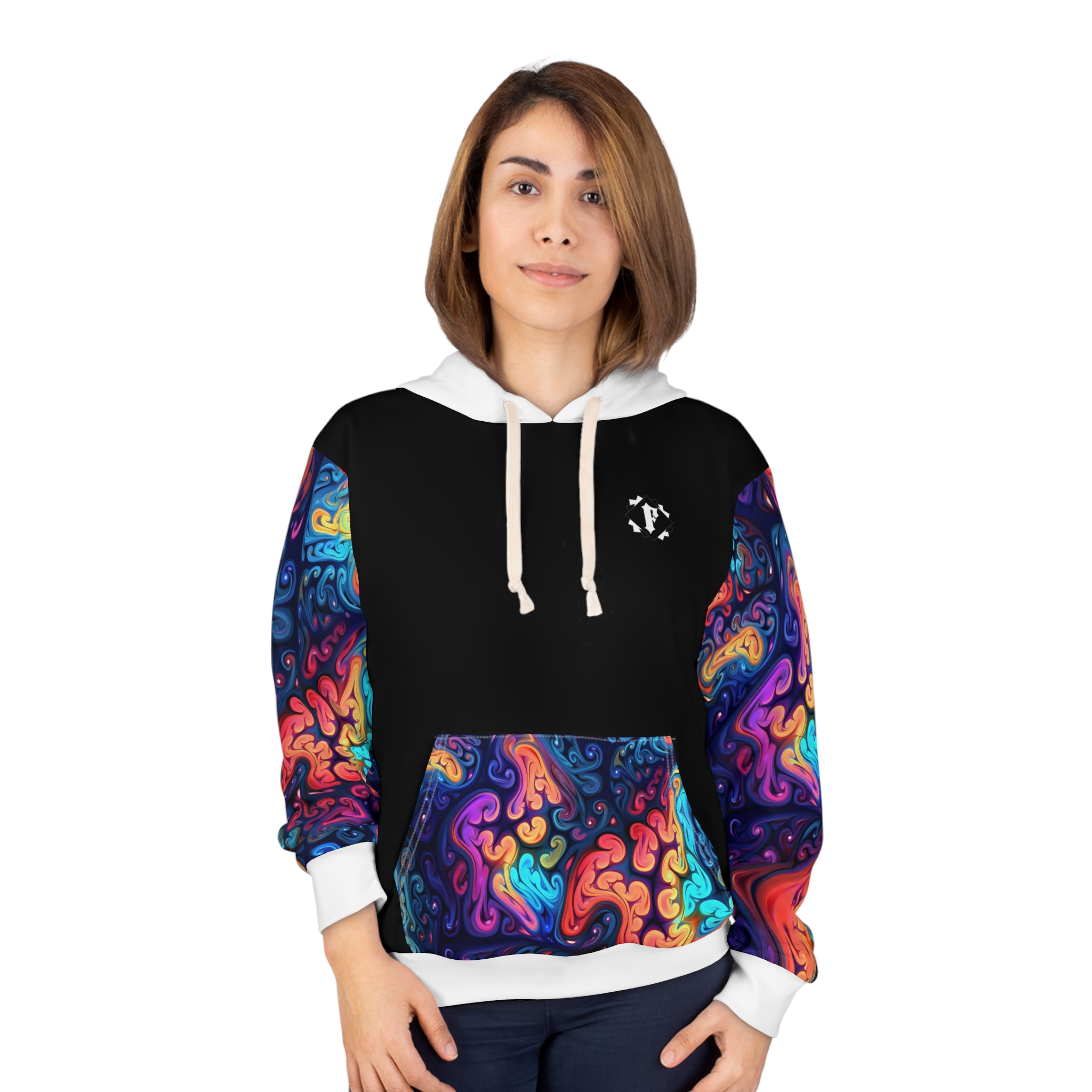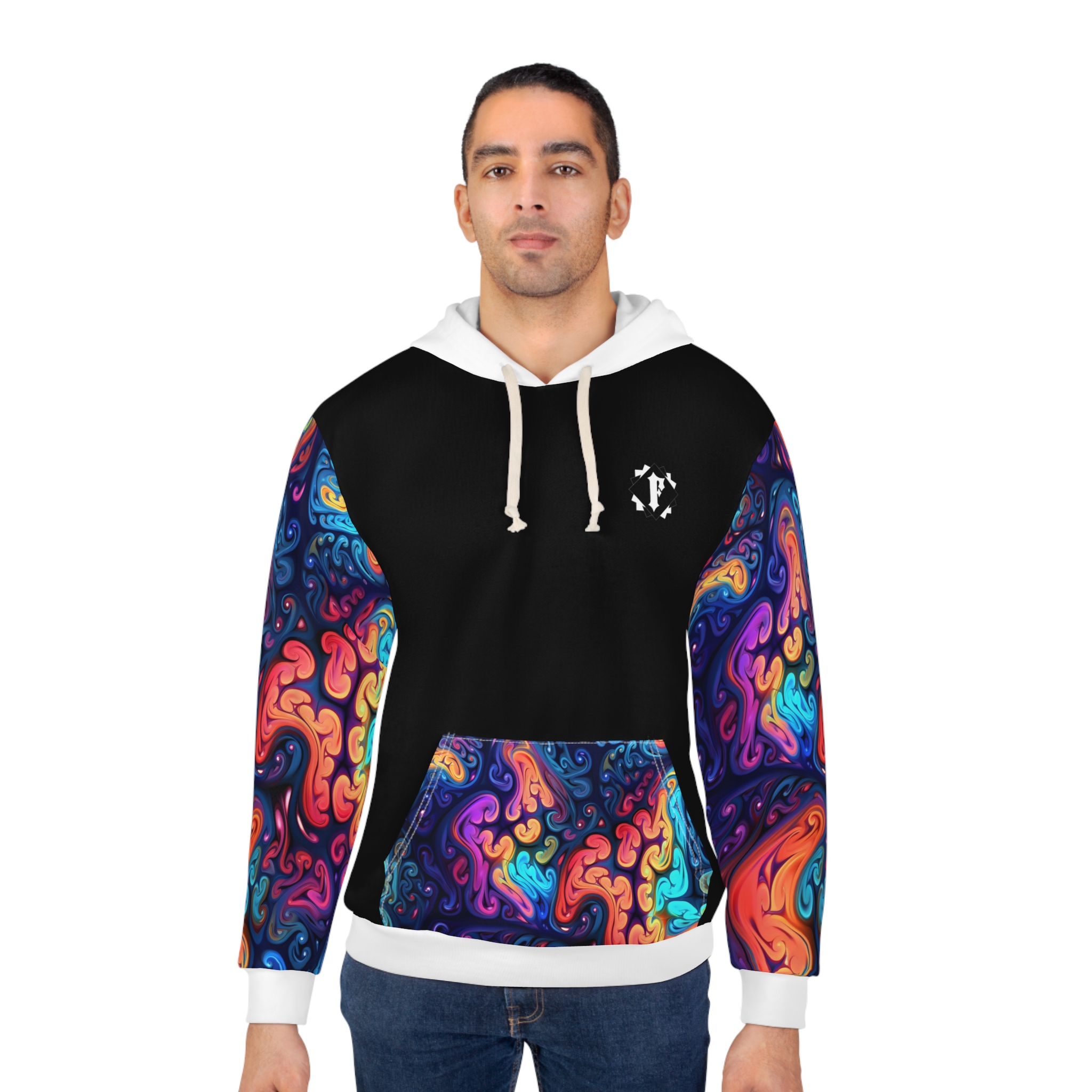 This Pullover Hoodie is made for warmth and comfort. Made to be easily customizable without white lines at the seams, this all-over print pullover hoodie is waiting for you to add a great design and it instantly becomes fashionable. It features a large front pocket, hood with drawstring, and is custom cut and sewn.