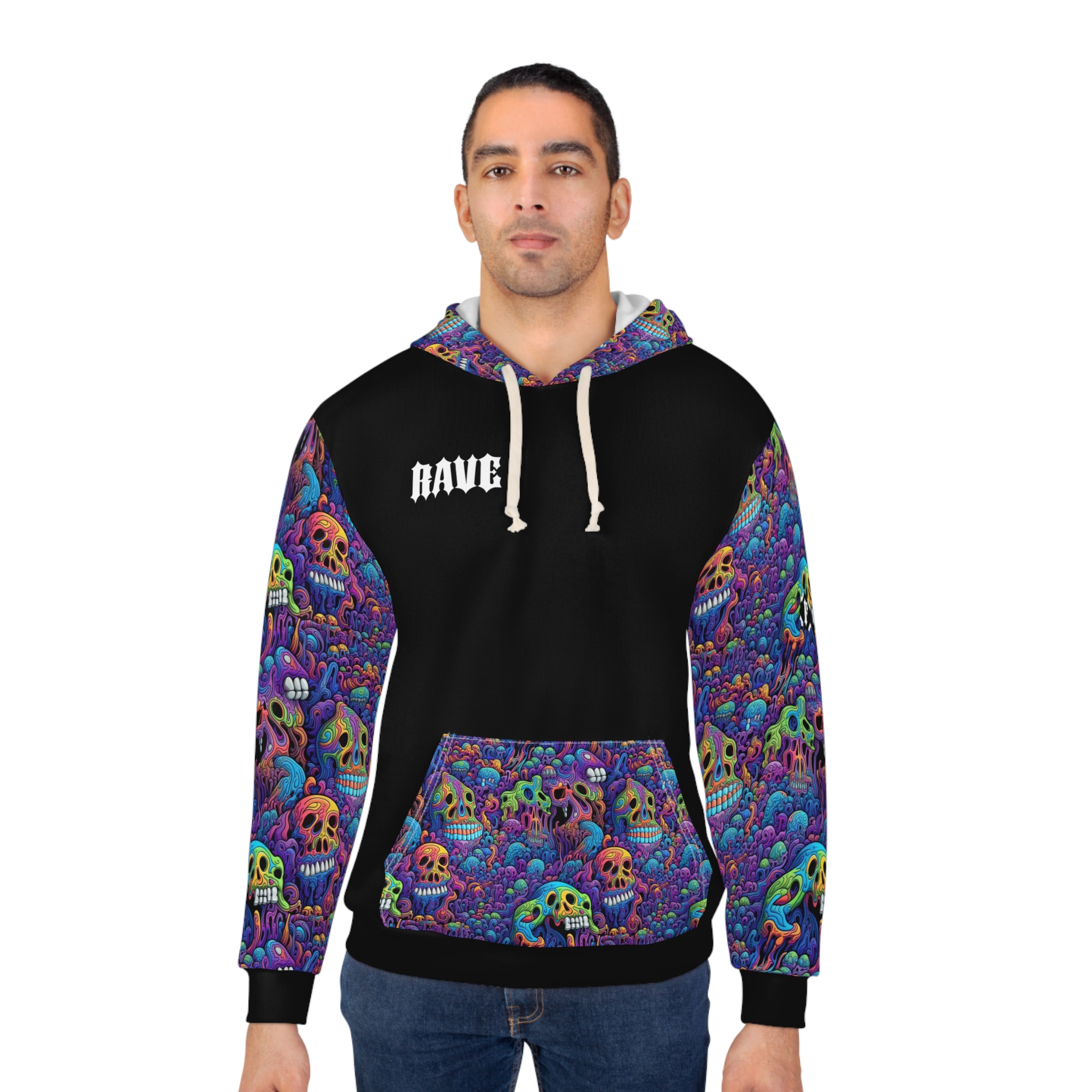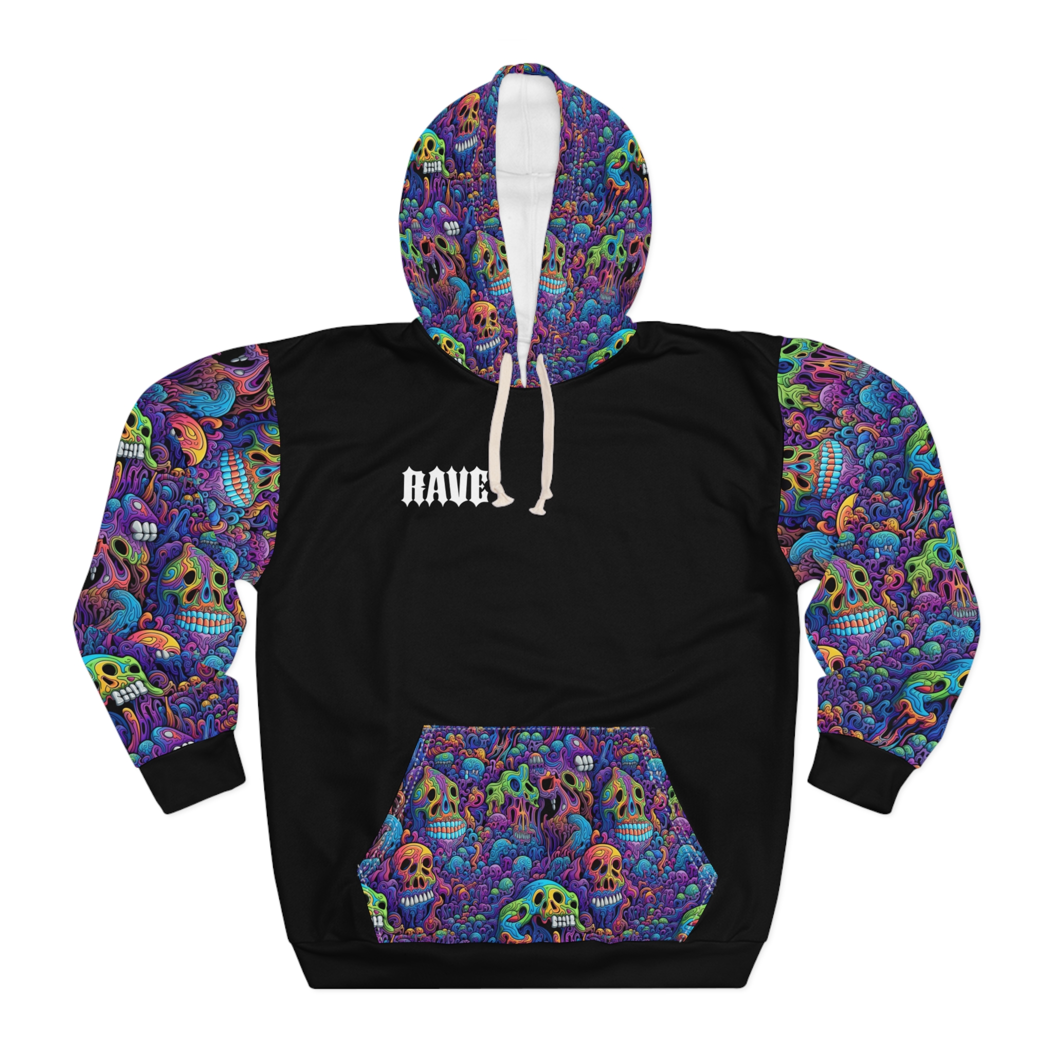 This Pullover Hoodie is made for warmth and comfort. Made to be easily customizable without white lines at the seams, this all-over print pullover hoodie is waiting for you to add a great design and it instantly becomes fashionable. It features a large front pocket, hood with drawstring, and is custom cut and sewn.